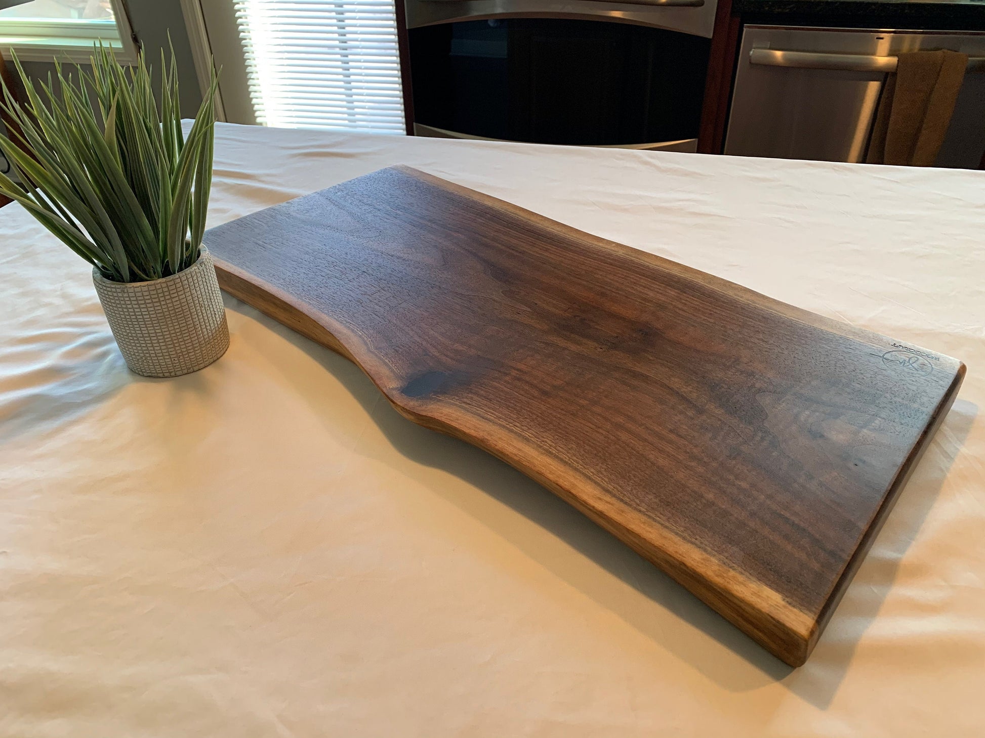 Amazing handcrafted, walnut live edge charcuterie board or serving board. This beautiful cutting board is a great functional addition to any kitchen or gathering. These boards are designed to serve everything from meat-and-cheese spreads to appetizers and snacks.